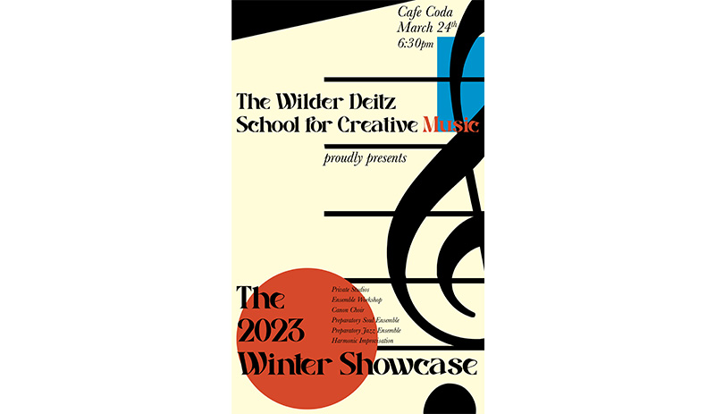 This project was commissioned by Ruben Arndt, Director of Operations at Wilder Dietz School for Creative Music, for their 2023 Winter Showcase. Ruben wanted a poster to hang up at the venue and to send to family and friends prior to the event. The objective for this design was to make a poster that felt mid-century and called back to the early days of jazz in the 1900s.